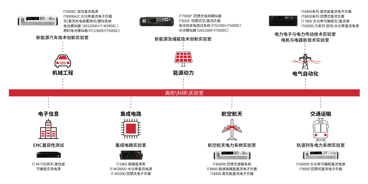 艾德克斯(ITECH)深耕“功率电子”产品测试领域,凭借优异的产品特性和广泛的行业应用积淀,深入高等教育新工科专业建设实践教学、关键技术科研攻关场景,设计研发新一代能馈式源载系统、高精度测试仪表设备,为高校打造贴近产业真实应用、更节能、更精准、更先进的实验教学与创新研究环境,为培养新产业、新技术的“新工科”人才培养贡献ITECH力量。ITECH为科研教育提供丰富的测试仪器,例如光伏模拟器、电网模拟器、电池模拟器、高精密源/测量单元、高精度直流电源、双向直流电源等产品。