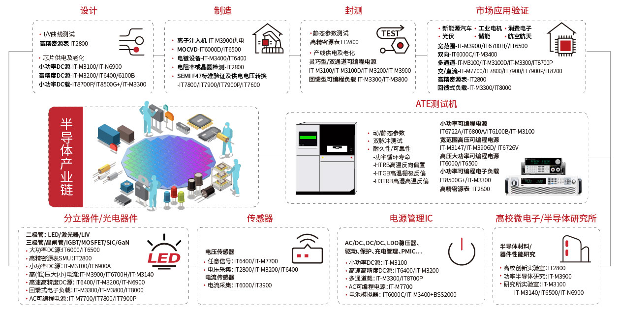 半导体,指常温下导电性能介于导体与绝缘体之间的材料,半导体产品主要分为四大类,分别为集成电路(IC),光电子器件,分立器件和传感器。 ITECH半导体解决方案覆盖从半导体材料验证、生产制造及半导体封测的整个产业链,为光电产业、研究机构、芯片研发企业及晶圆生产测试企业提供丰富的测试设备,例如IT2800系列高精密源/测量单元SMU、高速可编程直流电源(IT6000C)、双极性电源(IT6400)、高压老化电源(IT-M3140)以及低压大电流直流电源(IT-M3900系列)等产品。帮助用户快速实现器件IV特性测试、双脉冲测试、功率循环老化测试、动静态参数测试以及HTRB/HTGB/H3TRB测试等。