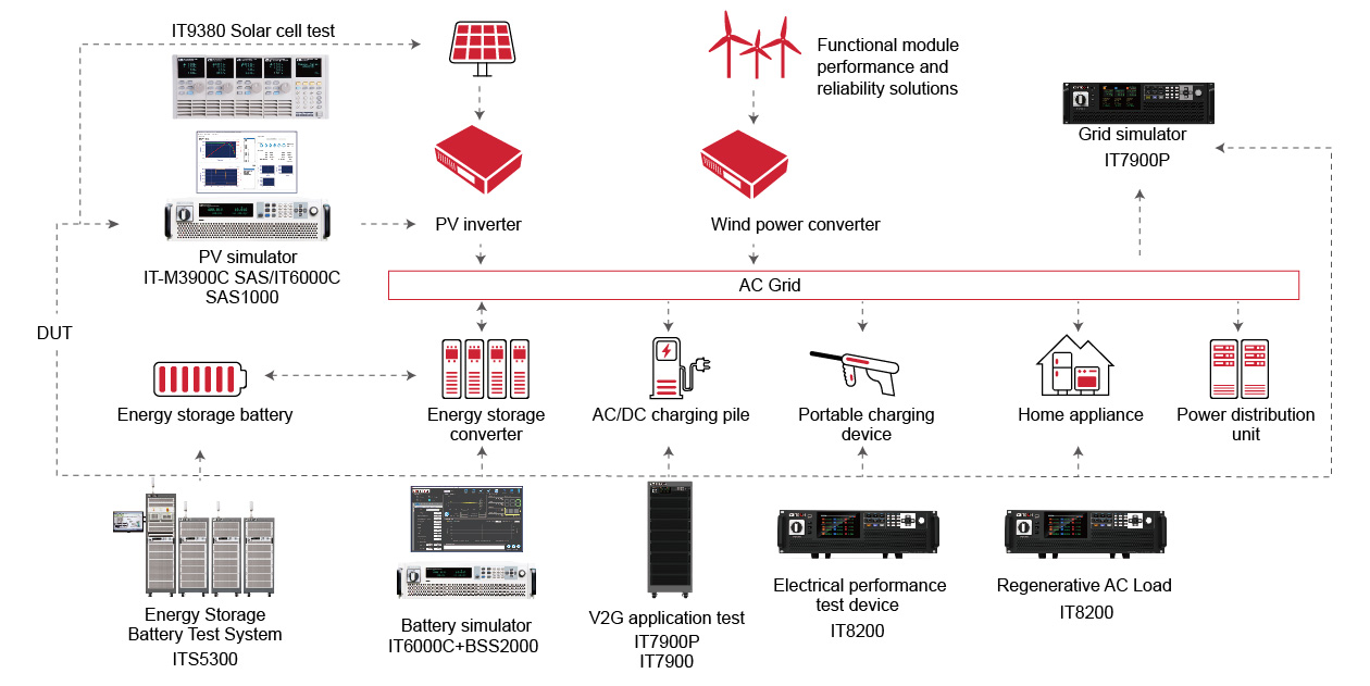 IIn recent years, as the energy crisis intensifies, renewable energy represented by solar, wind has been developing rapidly.ITECH provides products and solutions for the PV and energy storage test, such as solar modules/arrays, micro-inverters (DC-AC), energy storage batteries, energy storage converters, off-grid/grid-connected PV inverters, household energy storage devices, outdoor emergency energy storage power supply,etc. ITECH offers a wide range of high power density testing products and equipment, including PV simulators (up to 2250V/2MW), grid simulators (3U 15kVA, 960kVAmax), battery simulators, energy storage battery test system ITS5300, regenerative AC electronic load IT8200. Users can easily realize energy storage battery life test, hardware-in-the-loop simulation test, MPPT efficiency test, grid-connection adaptability test, and household device conversion efficiency test.