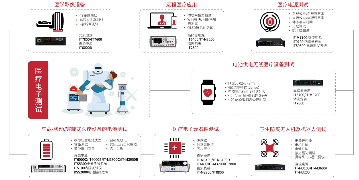 ITECH一直紧随医疗电子行业发展的步伐,提供高精度、高速度、高功率密度的电池模拟器IT6400、交/直流电源IT7800和IT6000、交/直流电子负载IT8800和IT8600,功率分析仪IT9100等诸多产品,为医学影像设备、可穿戴式医疗设备、医疗电源、医疗电子元器件、医疗用机器人、无人机等多个医疗电子领域提供精准、高效、节能的测试解决方案。