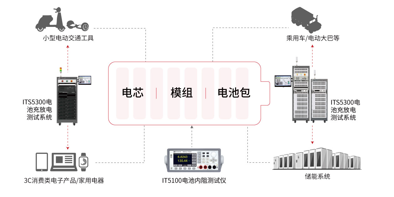 ITECH为用户提供专业的电池测试解决方案,适用于各类电池(铅酸,镍氢,超级电容,磷酸锂铁等),以及cell、pack、module等不同阶段的分阻,分容测试。电池系统满足电池行业测试标准:GB/T 31484-2015,GB/T 31485-2015,GB/T 31486-2015,GB/T 31467.1-2015,GB/T 31467.2-2015,GB/T 31467.3-2015,ISO12405-4-2018等。可实现低功耗生命科学仪器的电池寿命测试,EV动力电池的道路工况模拟,HPPC(混合功率脉冲试验),多通道电池包的独立、并联测试等。ITECH为新能源汽车、光伏储能、户用储能装置、便携式移动户外储能装置、IOT、手机数码、电动工具等领域提供完善的电池解决方案。