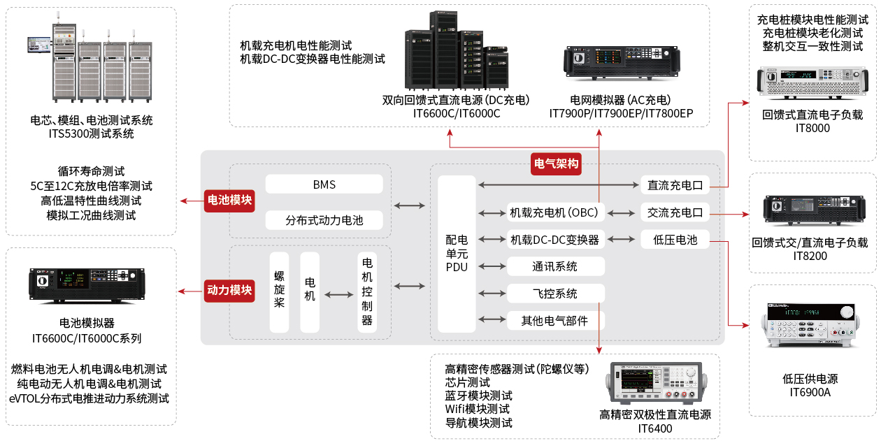 低空经济,是一项基于无人机、eVTOL和电动直升机等新一代航空器的重要产业,对其零部件和系统的测试尤为关键。依托于先进的测试仪器产品线,ITECH为这一领域的发展提供了高效且稳定的测试方案。这些方案覆盖了动力系统、航空电池、充电装置、高精密飞控传感器及通讯导航系统等多个关键领域。目前,ITECH能够提供包括单机3U 42kW和并机高达10MW的电池模拟器、光伏模拟器和双向直流电源,3U 21kVA的高功率密度电网模拟器、交/直流电源,以及高精密电源和电池测试系统等专业产品,为低空经济发展提供有利支持。