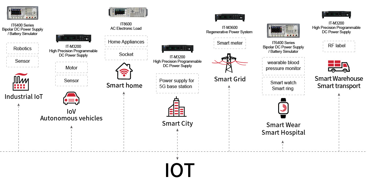 IoT is becoming more and more popular in today's world. There are many devices which are connected together by internet. ITECH IoT solutions provide power electronics test for these devices and make sure that they work stably and perform well.At present, ITECH IoT solutions have been used in many different applications and fields, such as wireless communication, automobile devices market,smart home, wearable devices and medical care, etc. The test items include low consumption power test, battery performance test,power supply test of communication module, high current anti test,smart home simulation test and so on.